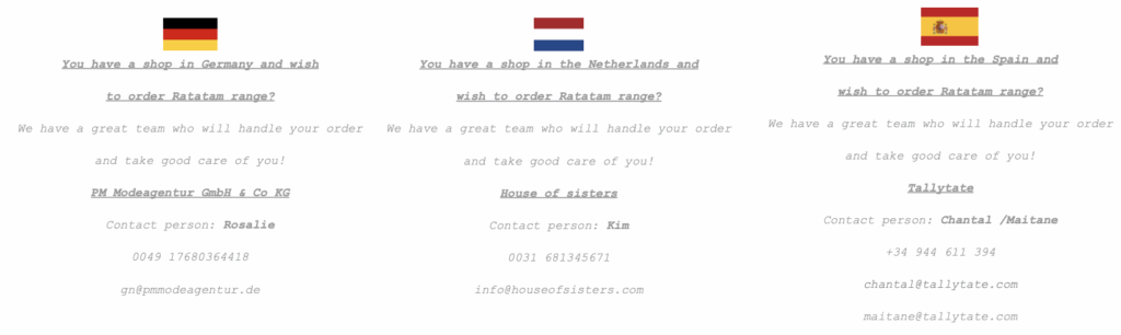 Notre marque est destinée à être revendue dans les boutiques de nos revendeurs ou sur leurs propres sites internet, la revente de notre marque sur des marchés ou autres plateformes de revente internet N ‘EST PAS AUTORISÉE sauf, à titre exceptionnel et si la demande a été faite en amont et validée par la marque Ratatam elle-même.