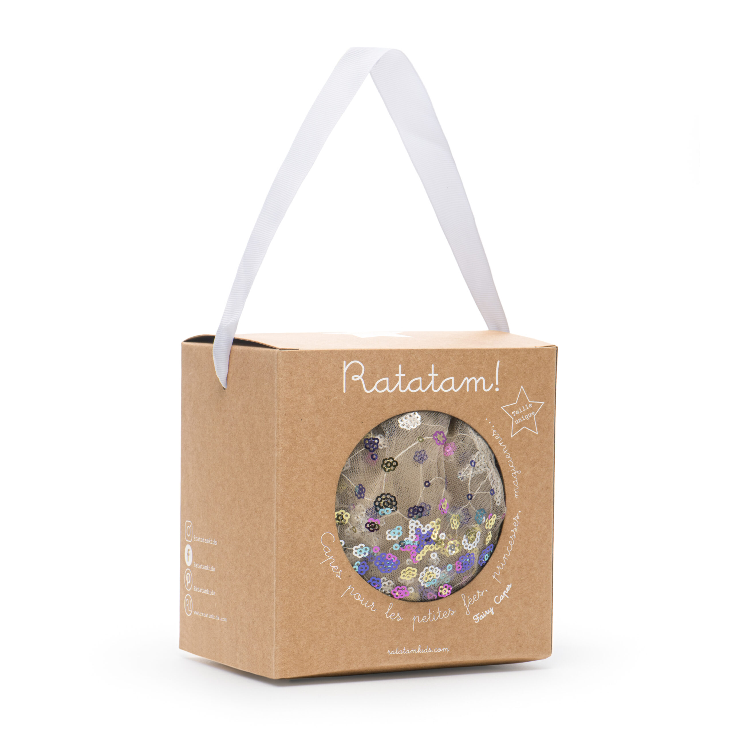 La cape de fée est en tulle, elle est brodée de sequins multicolores.