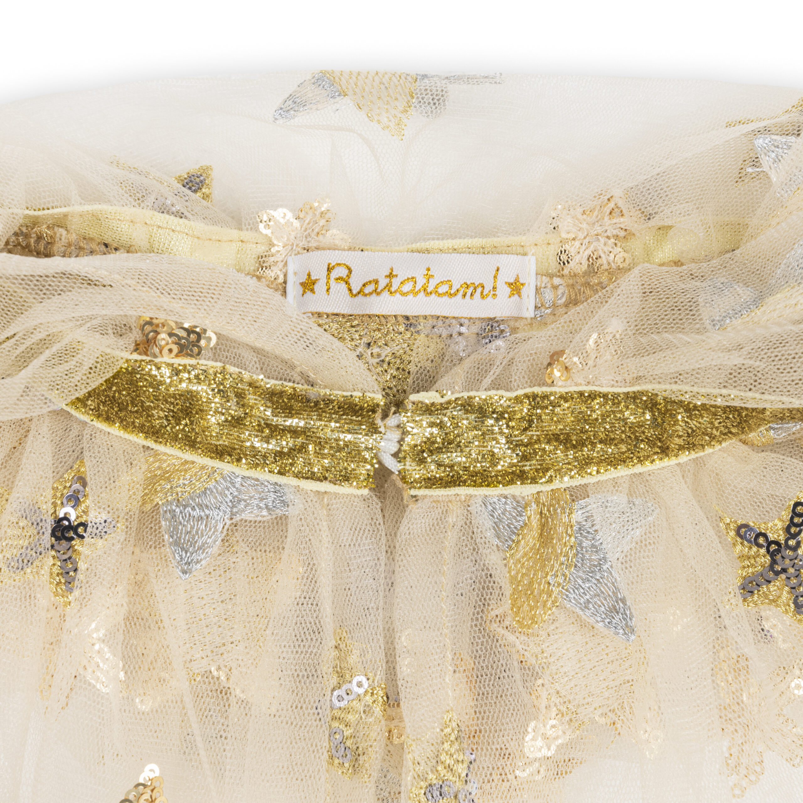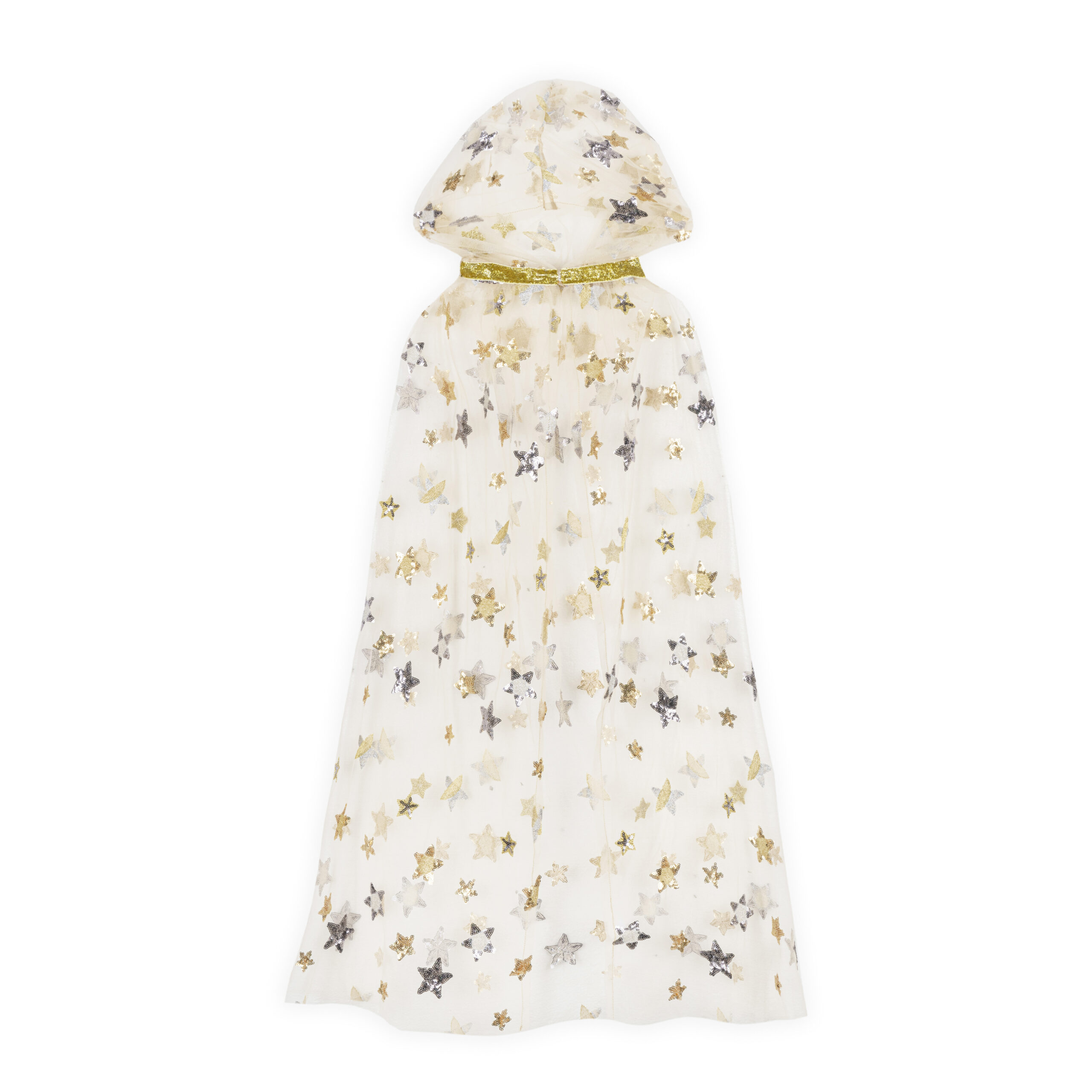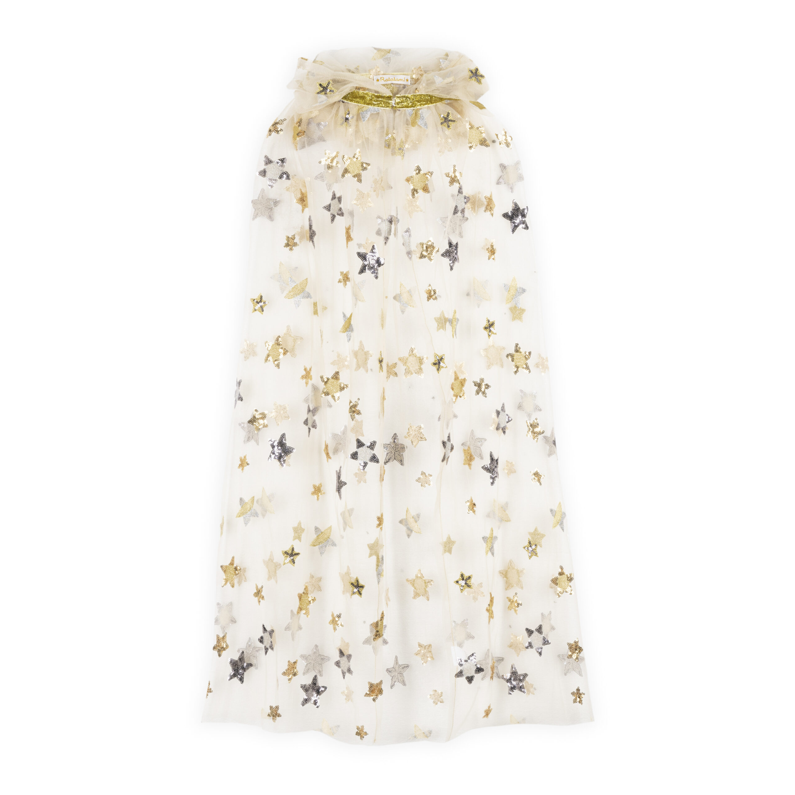 La cape de fée à capuche est en tule, elle est brodée de fil argent et de sequins dorés et argentés.