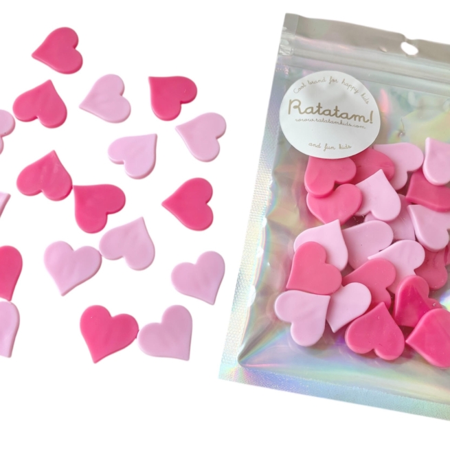 Et devinez quoi ? Chaque sac contient 20 petits cœurs rose pâle et rose fushia parfaits pour ajouter une explosion de couleurs à chaque virage ! C’est comme avoir son propre arc-en-ciel sur roues !