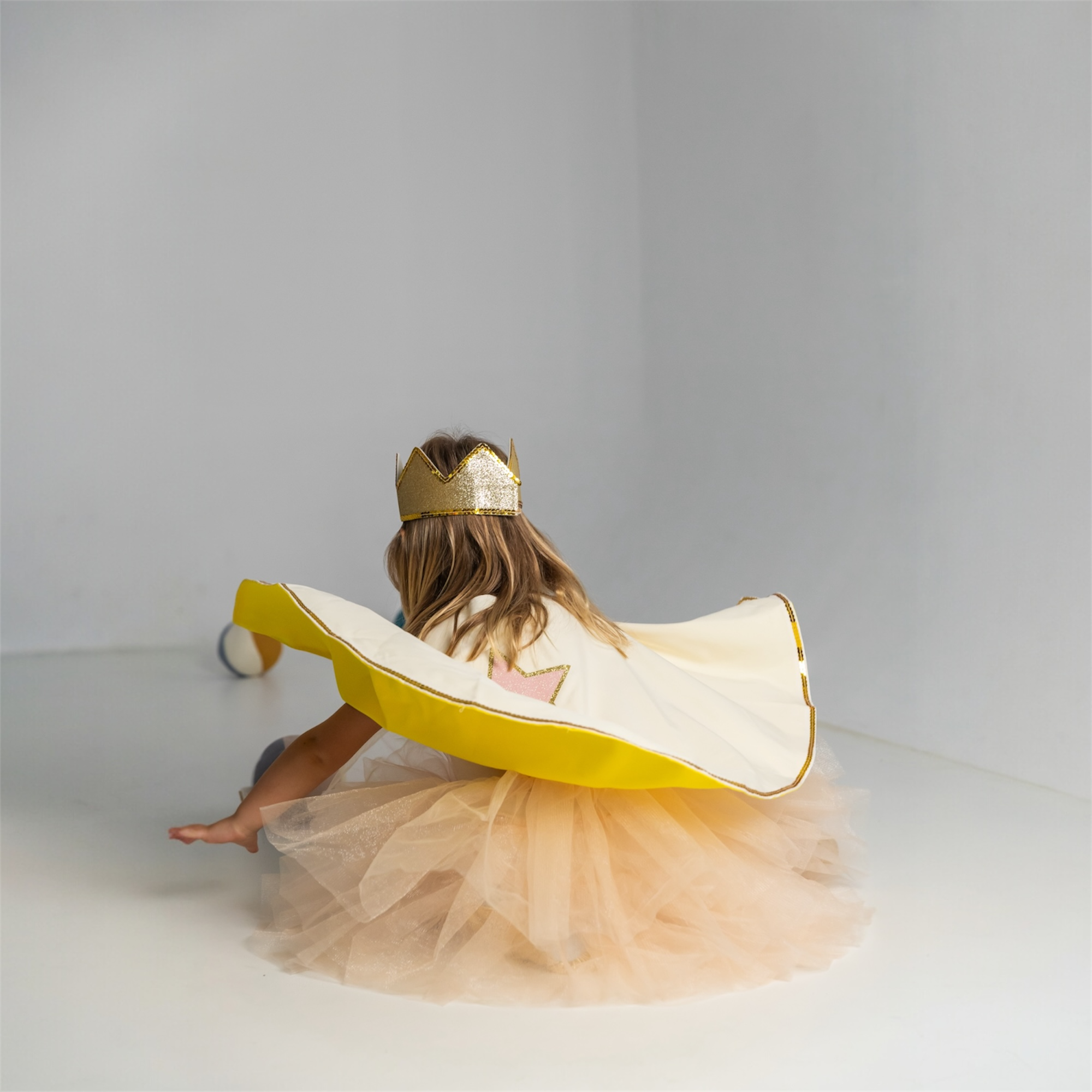 La cape dorée et la couronne assortie offrent un style digne des plus grands royaumes imaginaires. L’étoile scintillante apporte ce petit détail magique qui fait toute la différence.